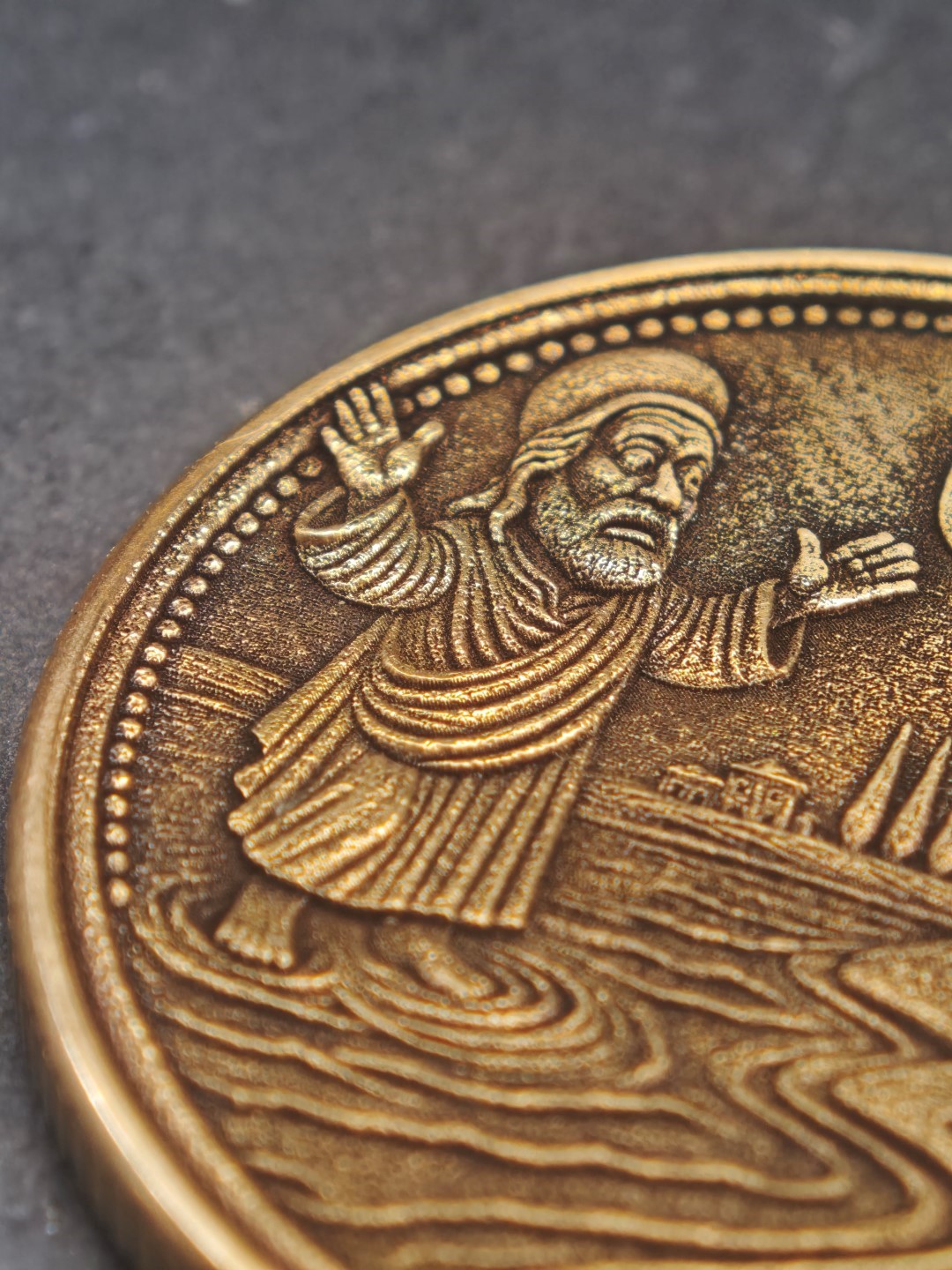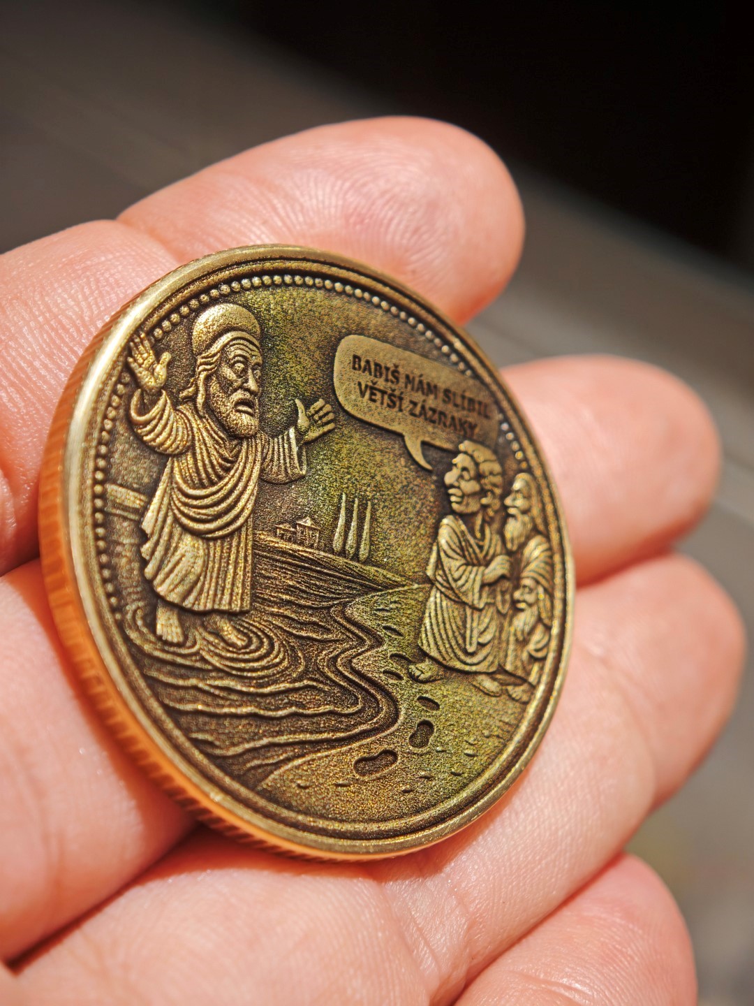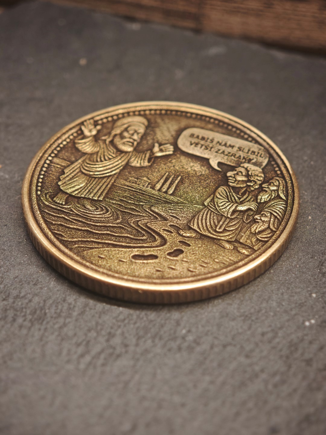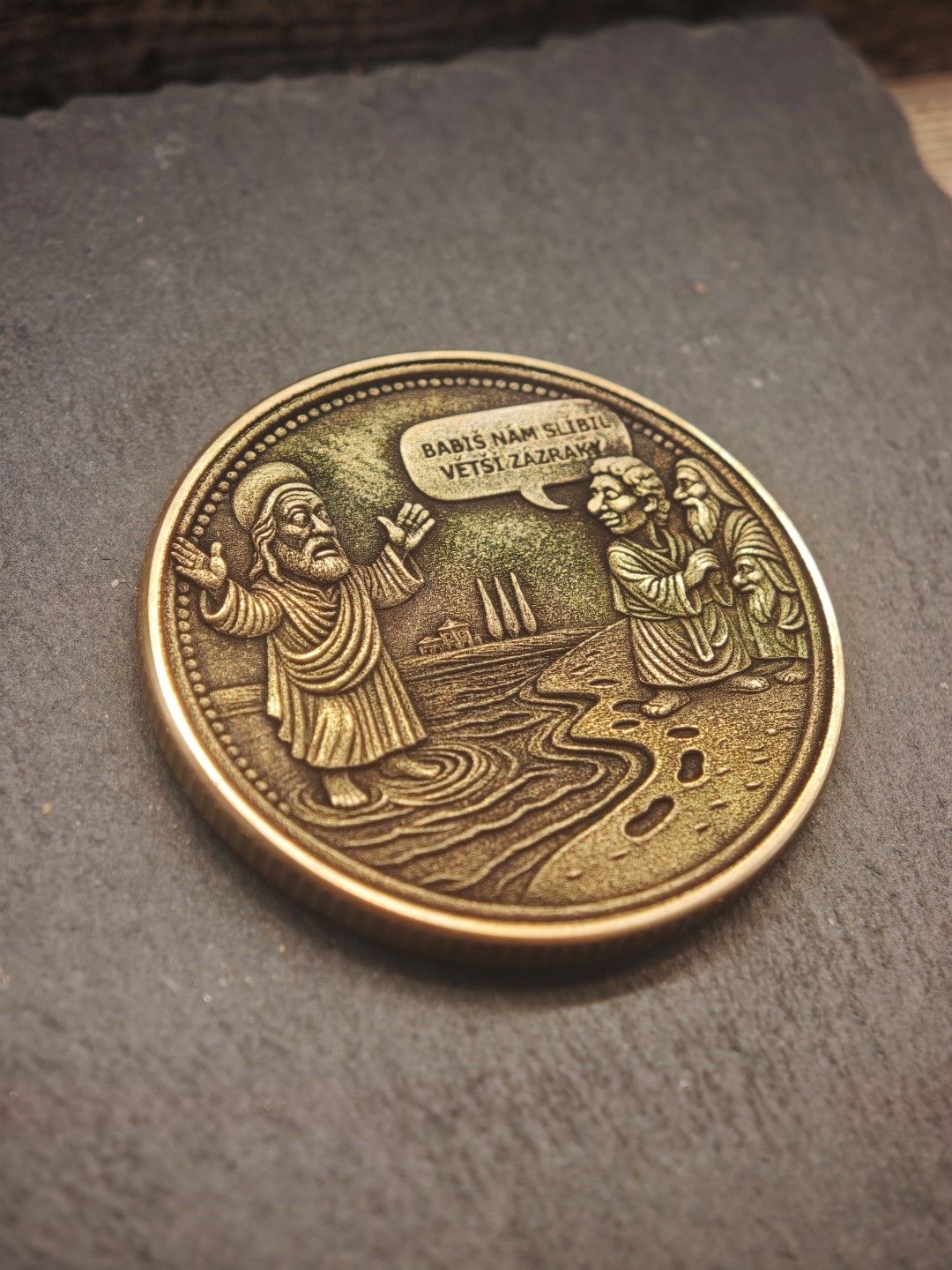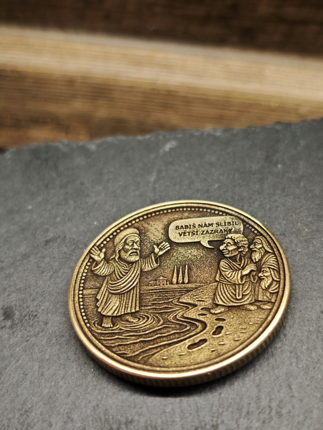 Mosazná mince o rozměrech 40×3 mm s vroubkovanou hranou.