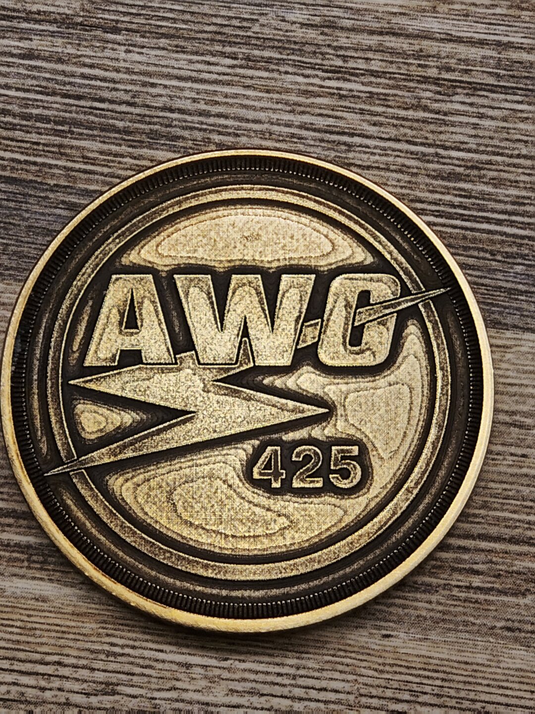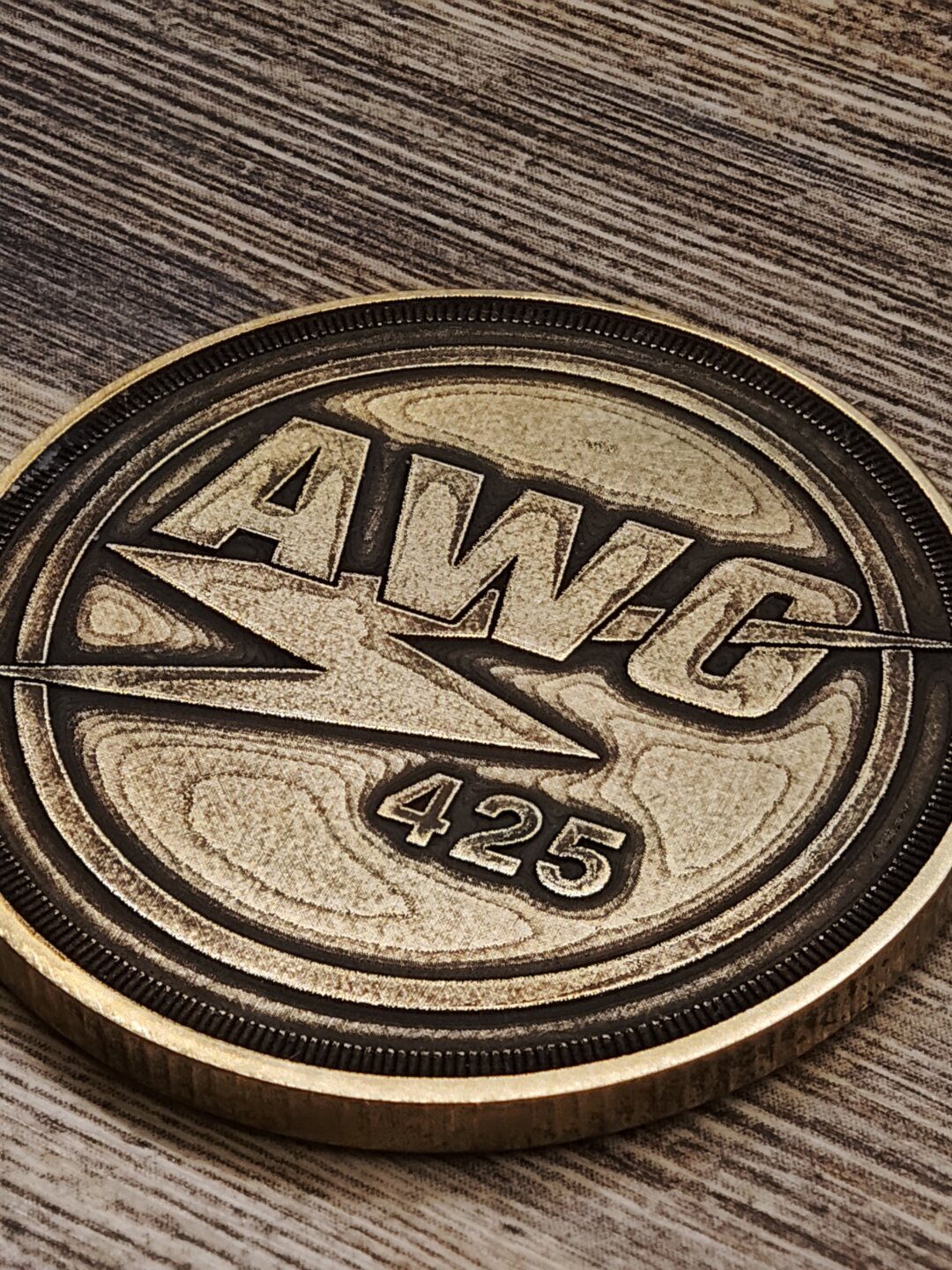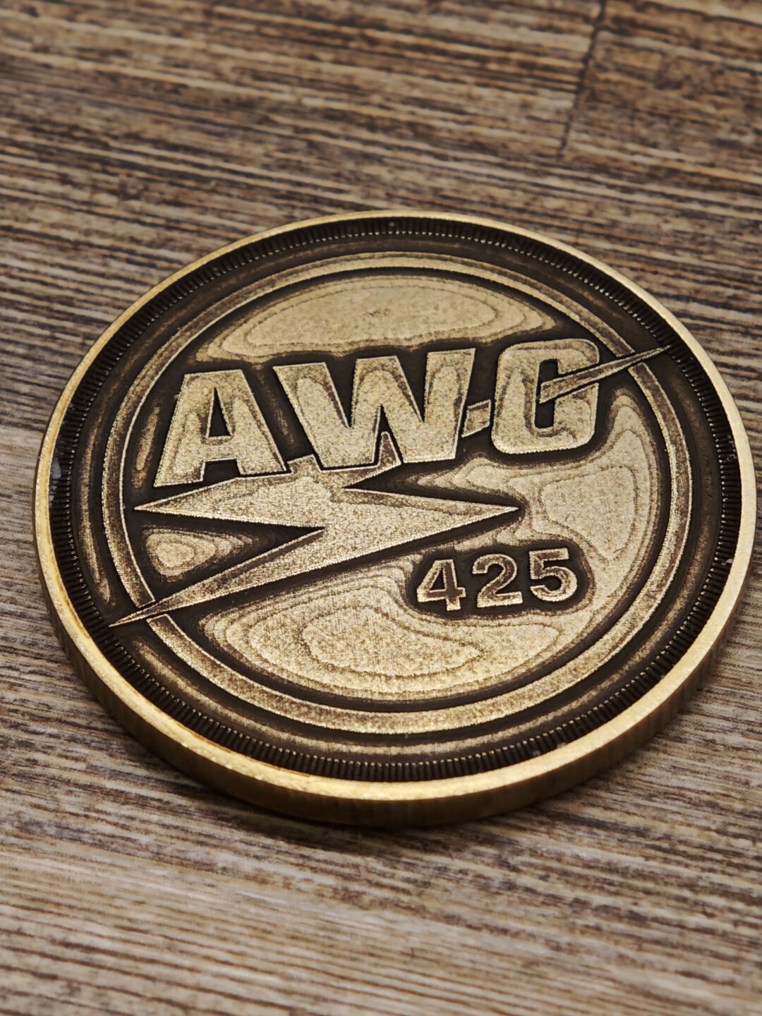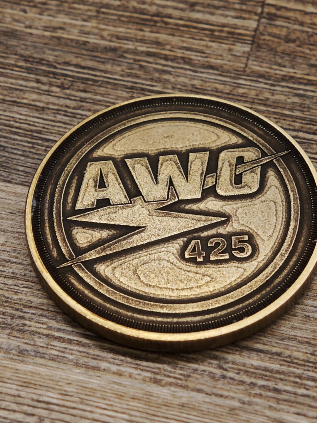Mosazná mince o rozměrech 40×3 mm s vroubkovanou hranou.