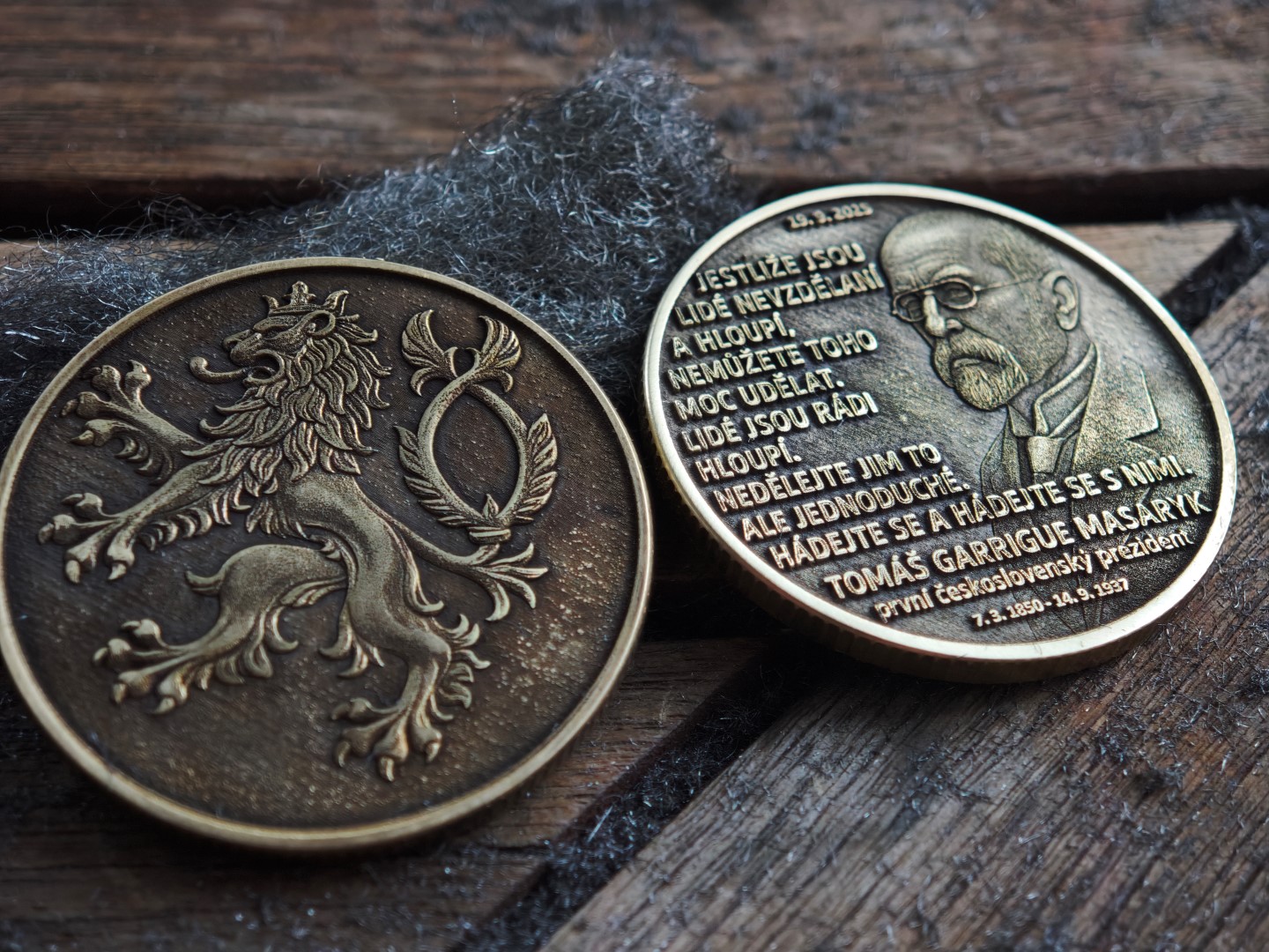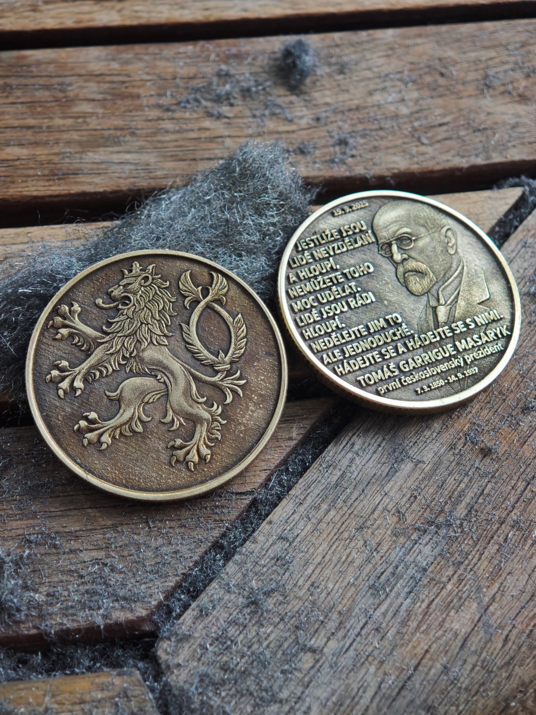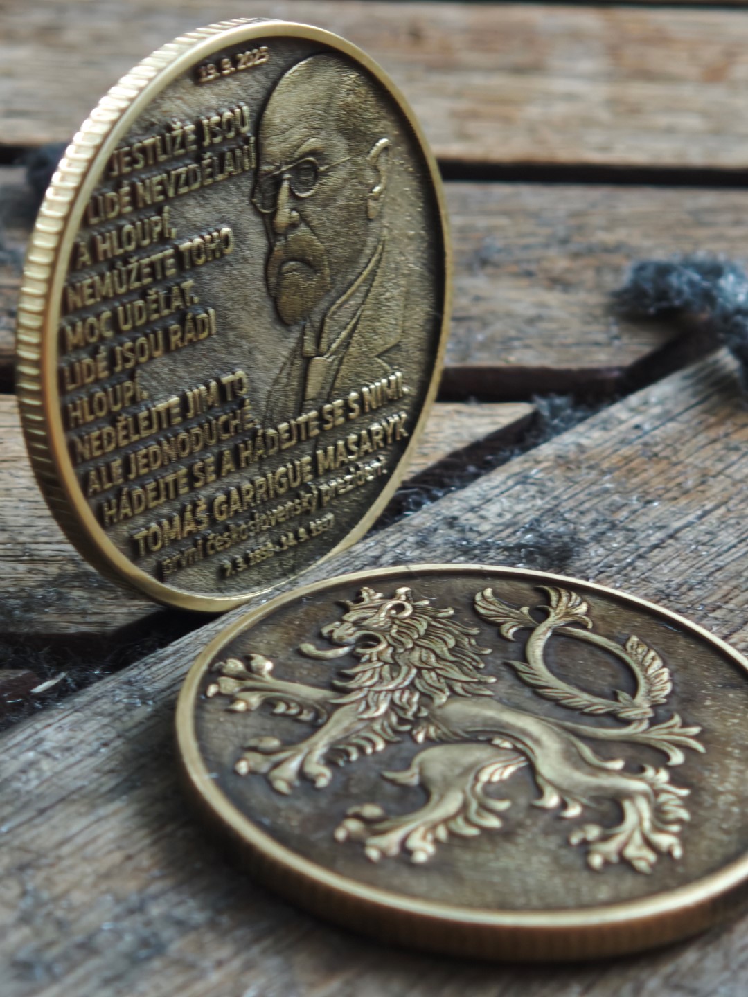 - Standartní oboustranná – z přední strany T.G.M. a ze zadní Český lev – střední hloubka gravírování (na fotografiích najdete variantu standart a prémium)
