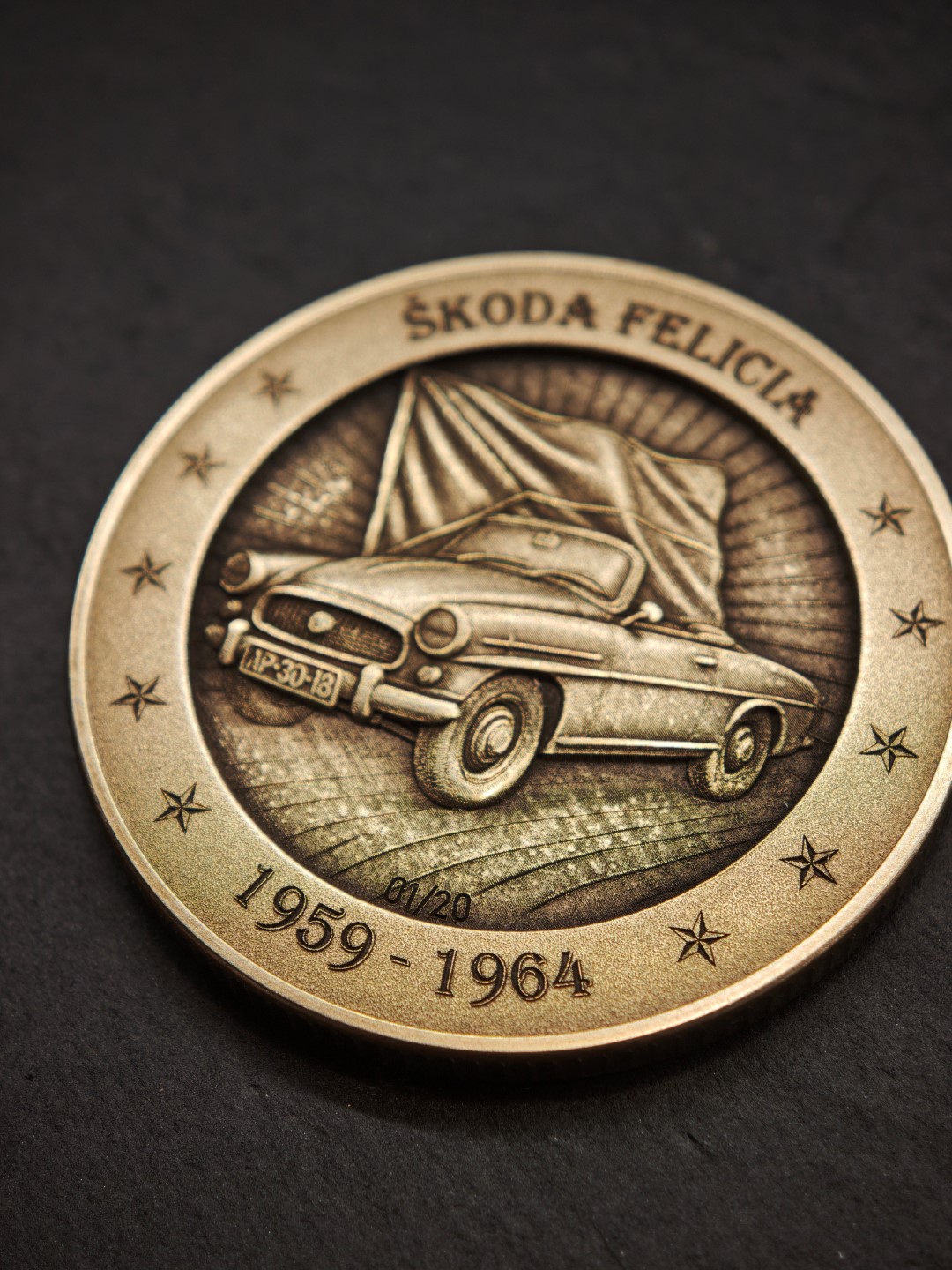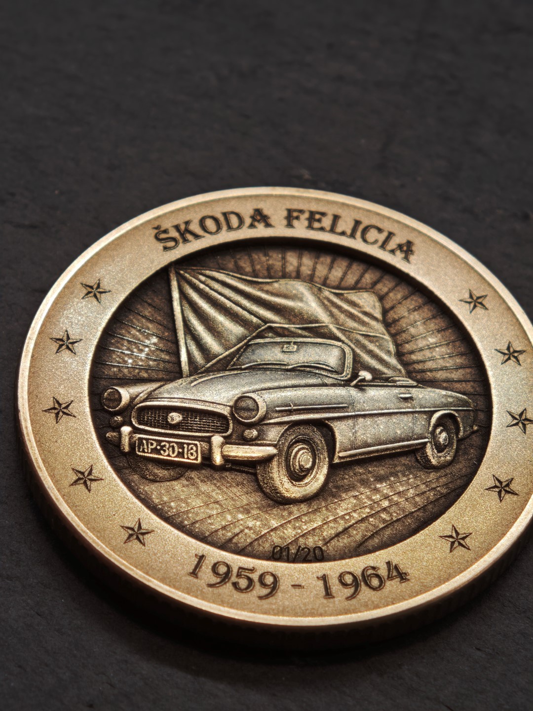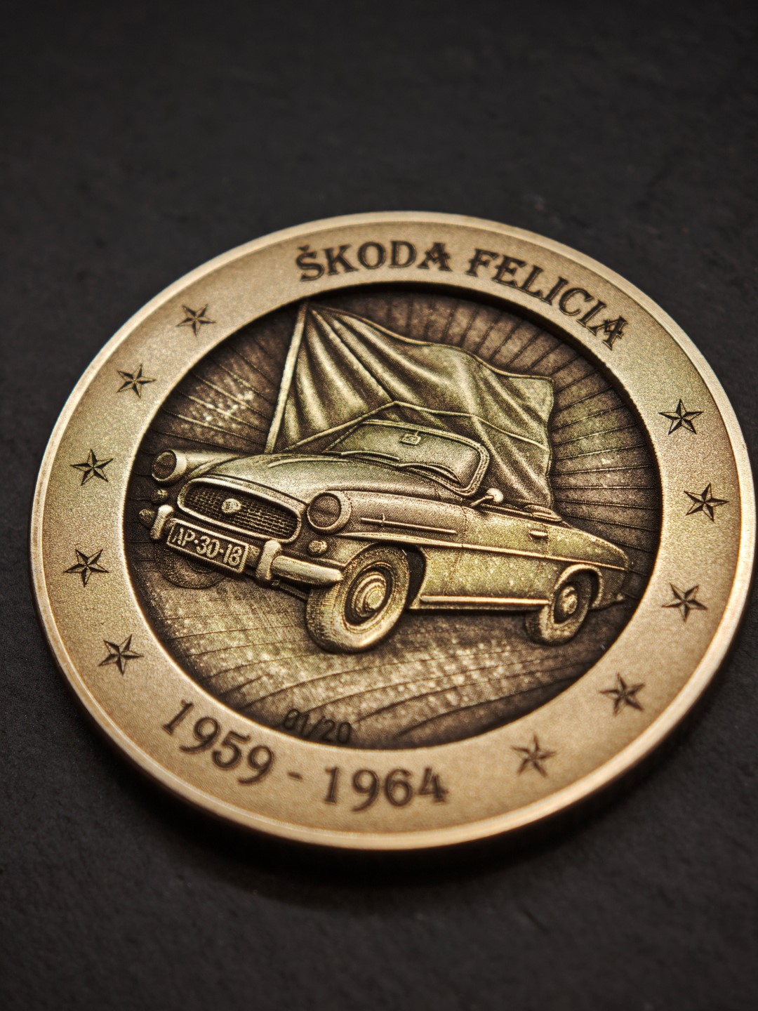 Pamětní mince / plaketa s motivem oblíbeného socialistického kabrioletu.