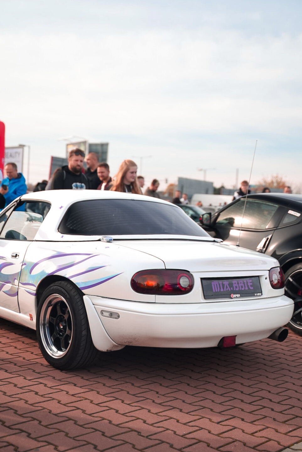 Mazda MX-5 NA (Miata) s motorizací 1.6 v bílé perleťové barvě s fialovým chameleonem. (V minulém roce přidán polep)